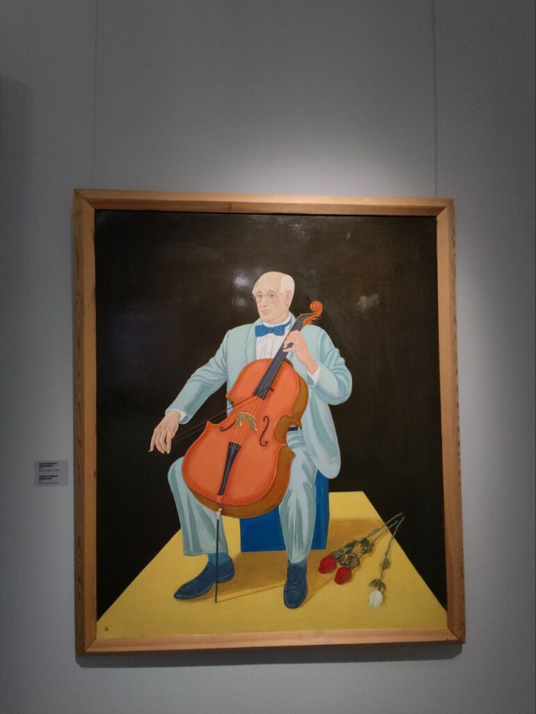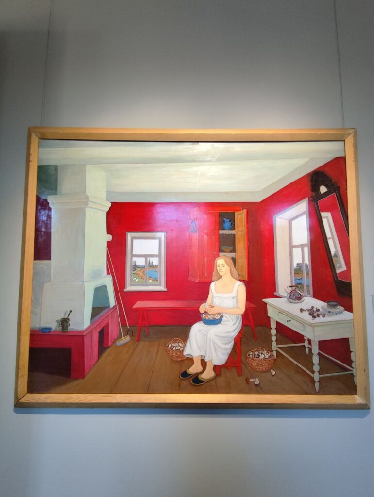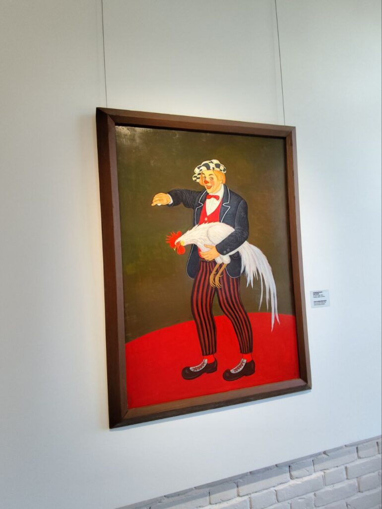 Выбрав для себя экскурсию, я отправилась погружаться в мир прекрасного. Юрию Рысухину было отдано максимальное количество залов в музее, и давно хотелось познакомиться ближе с творчеством художника, поэтому выбор пал на него. Галерея художника в музее разбита по темам: «Цирк», «Реннессанс», «Времена года» – в каждом зале гости погружаются в особенное настроение. Рука и стиль художника становятся узнаваемыми после знакомства буквально с несколькими произведениями – яркий красный цвет присутствует везде. Но он у него не кричащий, не режущий глаз, а позитивный, оптимистичный и заряжает энергией. Ещё на большинстве картин – узнаваемая тематика: село, поле, деревенский дом, трактор и сельскохозяйственная бригада.