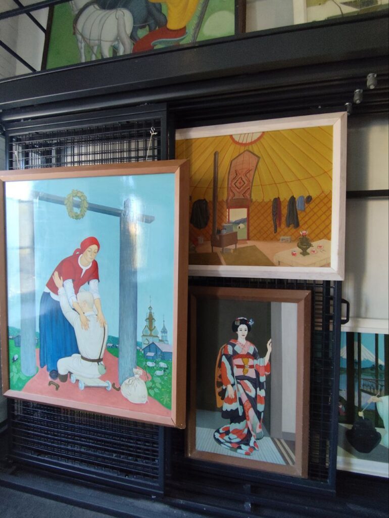 А ещё посетители могут оценить две необычные музейные локации – мастерскую художника, где иногда можно лично встретить мастера и даже взять у него автограф. Правда, в этот раз автор отсутствовал. А так же – склад открытого хранения, здесь создана система принципиально нового экспонирования, без нарратива выставочного контекста.
